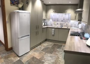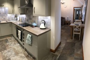 Slate tiled floor, Dishwasher, Washing Machine, Fridge/Freezer, Electric Oven/Hob with extractor hood, Microwave, Toaster and Kettle plus plenty of Crockery